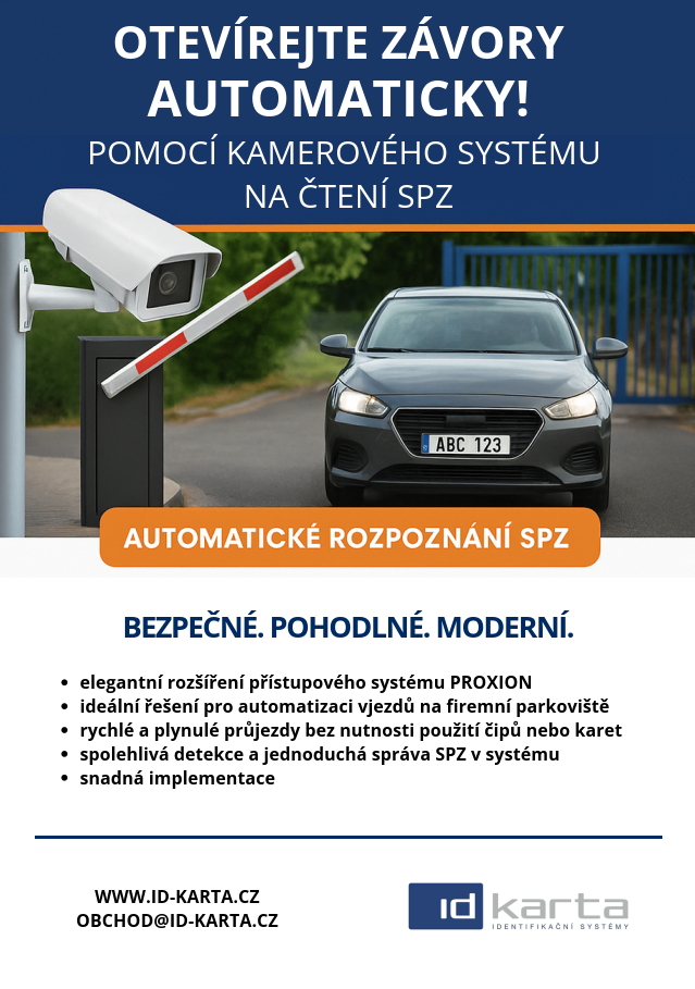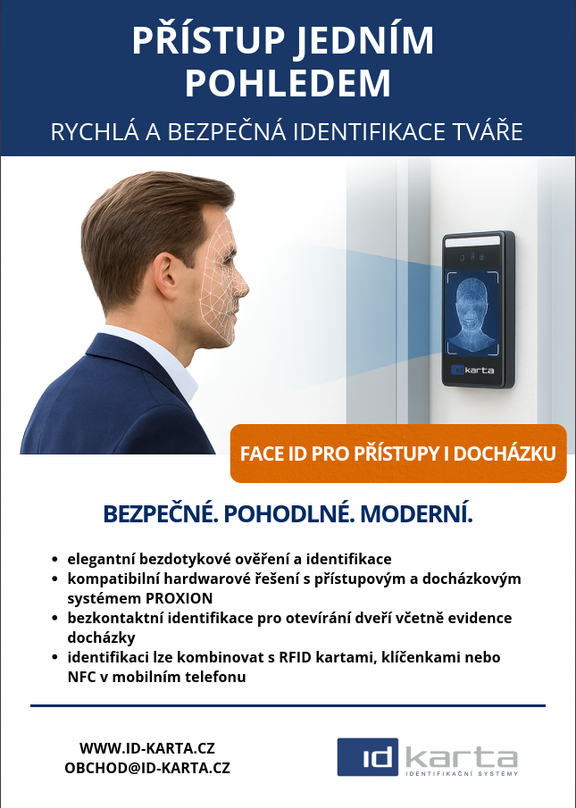 Pro přístupový a vjezdový systém máme novou identifikační technologii. Snímání tváře FaceID a kamery pro čtení SPZ. Více v sekci přístupové systémy a vjezdové systémy.